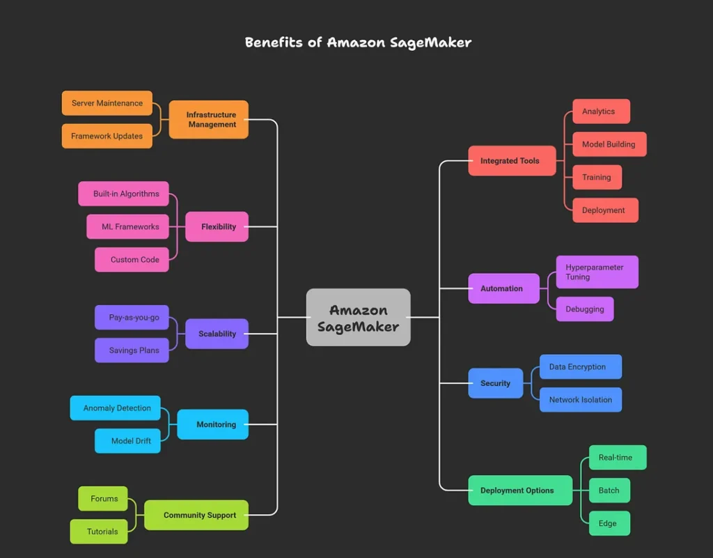 Amazon SageMaker’s benefits make it an essential tool for organizations looking to innovate quickly and securely with machine learning, while keeping costs and operational complexity low.