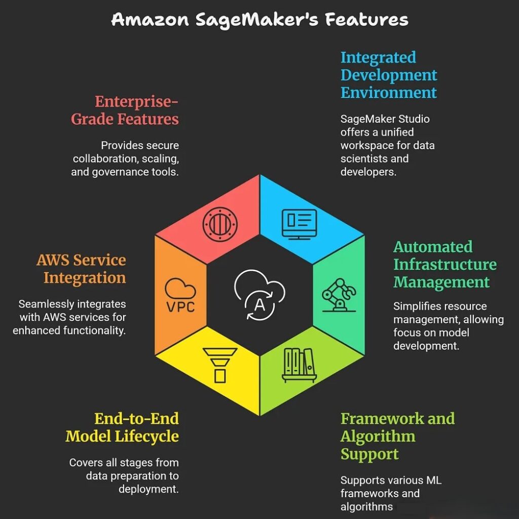 - Integrated with other AWS services, SageMaker leverages cloud storage (like S3), compute (such as EC2), and security tools, providing deep integration into modern cloud architectures.SageMaker offers features for secure collaboration, automatic scaling, cost optimization, and enterprise-grade governance.