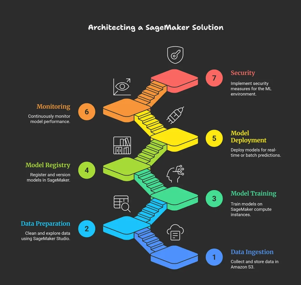 Architecting a solution using Amazon SageMaker involves designing a scalable, modular, and efficient machine learning (ML) workflow by leveraging SageMaker’s capabilities in data preparation, model training, tuning, deployment, and monitoring. A typical architecture incorporates well-defined components for each phase of the ML lifecycle, integrated with other AWS services to streamline operations and accelerate time to market.