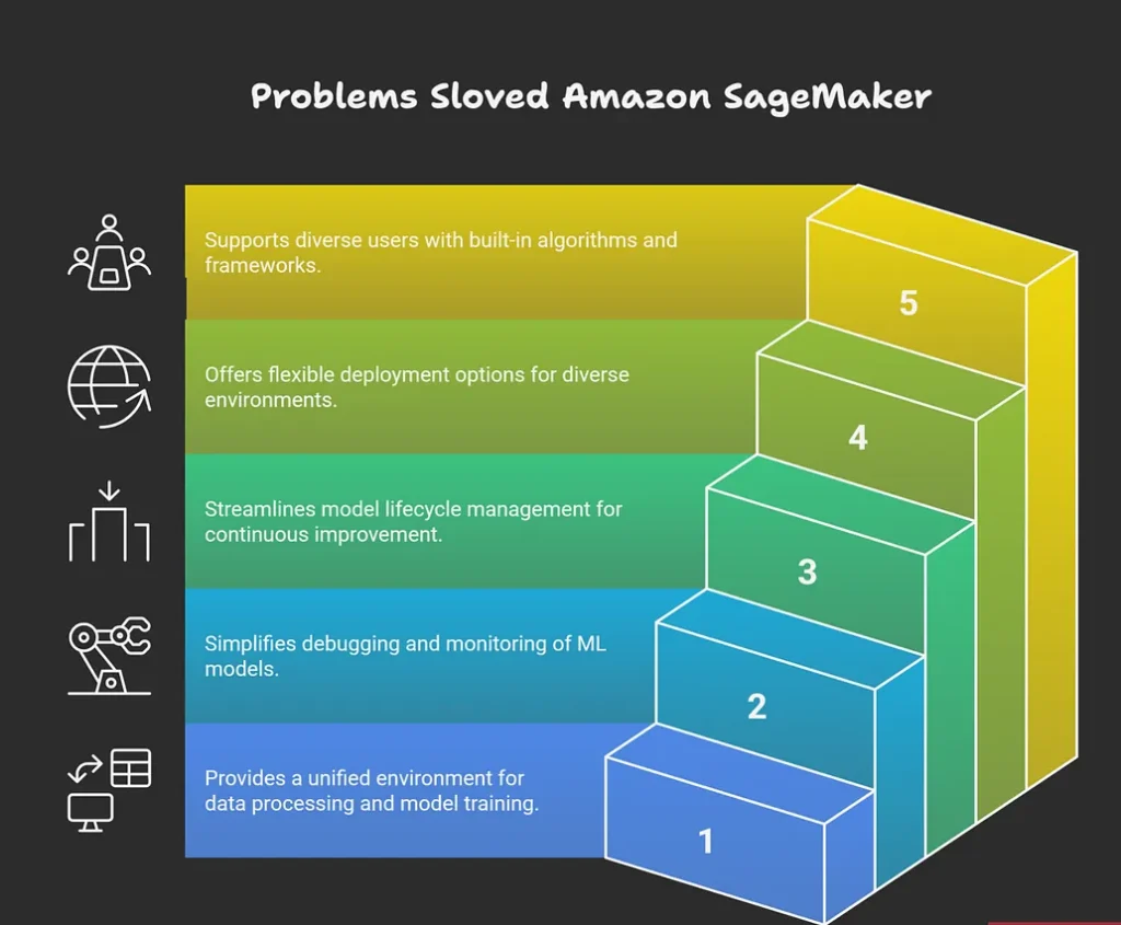 - Amazon SageMaker solves the problem of making machine learning development, deployment, and scaling accessible and efficient for organizations and developers, even those without deep ML or infrastructure expertise. It eliminates the complexities and “undifferentiated heavy lifting” typically required to build, train, tune, deploy, and manage ML models at scale.
