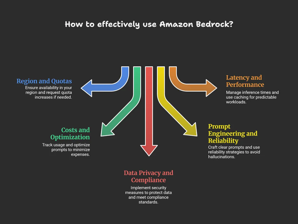 When using Amazon Bedrock, consider region availability, cost monitoring, model-specific limits, data privacy compliance, prompt engineering best practices, and fallback strategies for reliability.