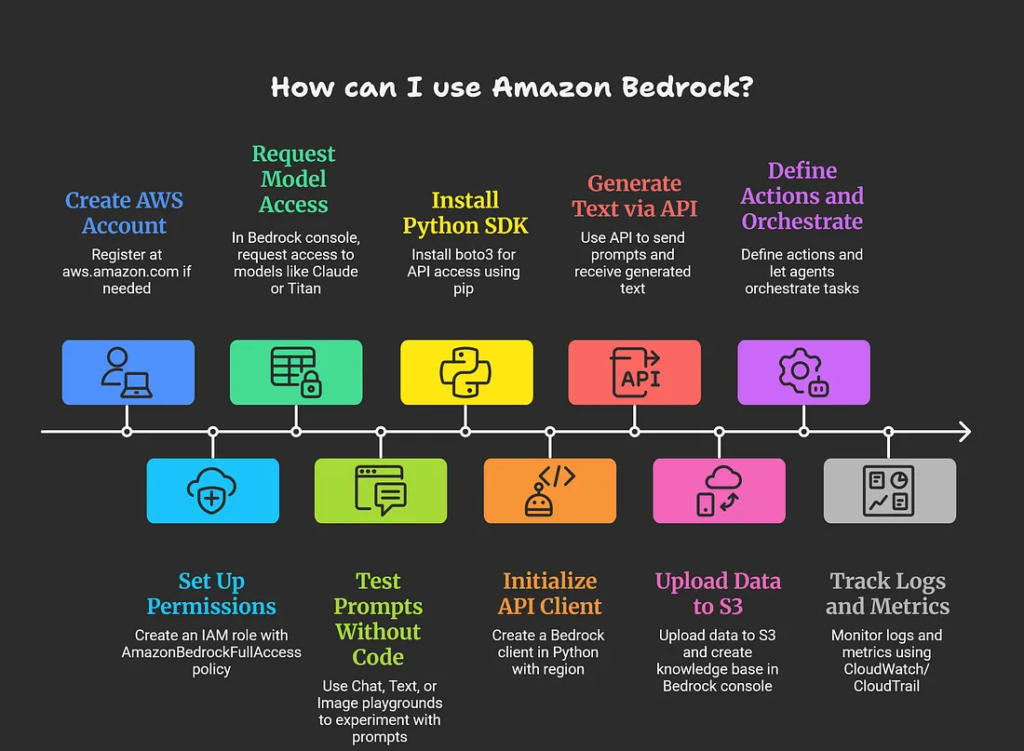 To use Amazon Bedrock, start by setting up an AWS account, enabling model access in the console, and experimenting via playgrounds or APIs; no ML infrastructure is needed as it’s fully managed.