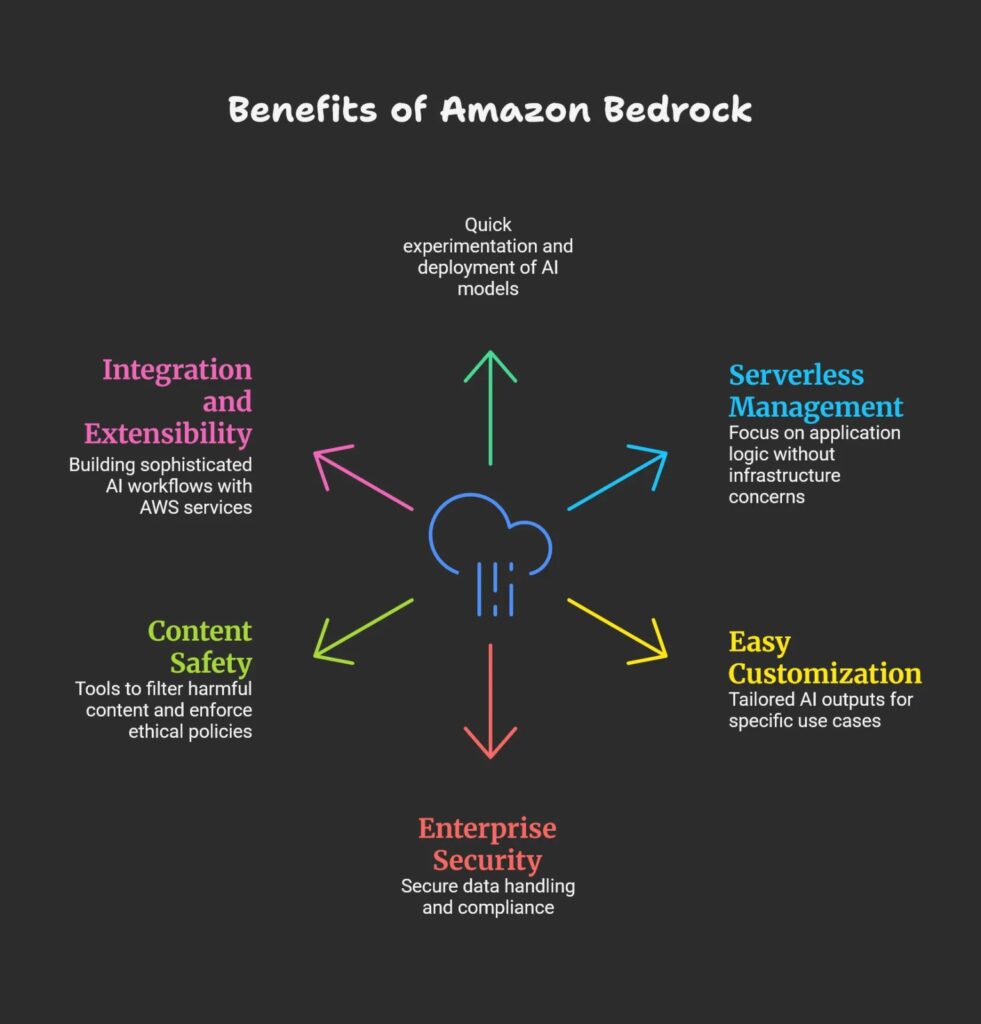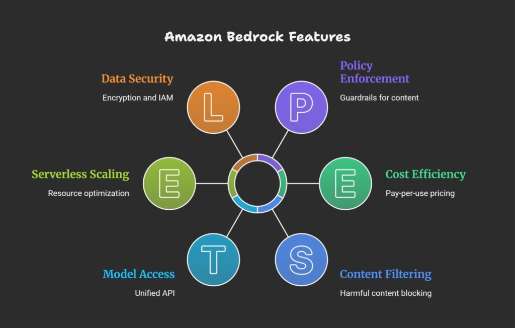- Infrastructure management: Developers avoid provisioning servers, GPUs, or clusters; Bedrock is fully serverless and handles automatic scaling, updates, and availability.