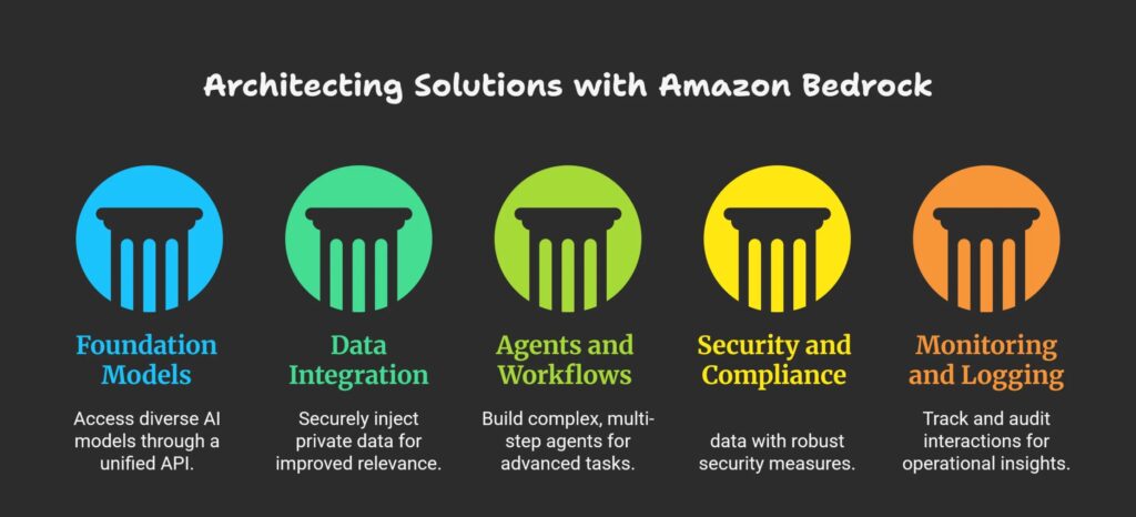 To architect a solution using Amazon Bedrock, you typically build a generative AI-powered application or agent by integrating Bedrock’s foundation models with your data sources, business logic, and AWS services for security, scaling, and orchestration.