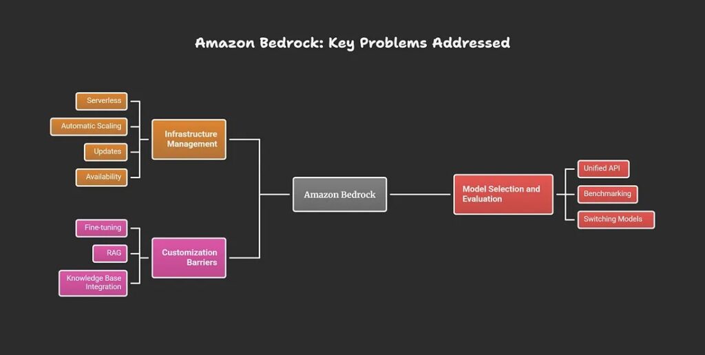 Amazon Bedrock solves the challenges of building and deploying generative AI applications by providing managed access to multiple high-performing foundation models without requiring developers to handle infrastructure, model training, or scaling themselves. It eliminates the need to choose, provision, and manage individual AI providers or hardware like GPUs, while ensuring enterprise-grade security and data privacy.