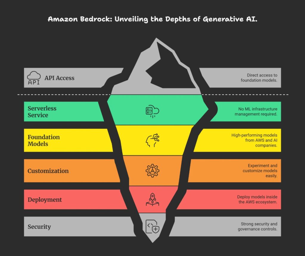 - Amazon Bedrock is an AWS fully managed, serverless service that gives you API access to many high-performing foundation models (FMs) from AWS and leading AI companies so you can build generative AI applications without managing ML infrastructure. It is designed to let developers quickly experiment with, customize, and deploy models like LLMs and image generators inside the AWS ecosystem with strong security and governance controls.